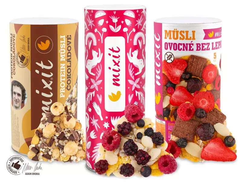 V této sadě jsme připravili bezlepkové menu podle Mixit. Ve třech tubusech ochutnáte ovocné i čokoládové müsli. Speciální mix ze série Musli zdravě potěší chutným výběr lesních plodů (rybíz, borůvky, ostružiny, maliny), které souzní s pořádně křupavým a lehkým kornflejkovým základem. To vše je doplněno o zdroj zdravých tuků v podobě konopných a slunečnicových semínek s mandlí. Proteinové müsli lezce Adama Ondry je plné čokolády a pražených lískových ořechů a speciální ovocný mix bez lepku jsme zasvětili rybízu, višním, malinám a čokoládových polštářkům.