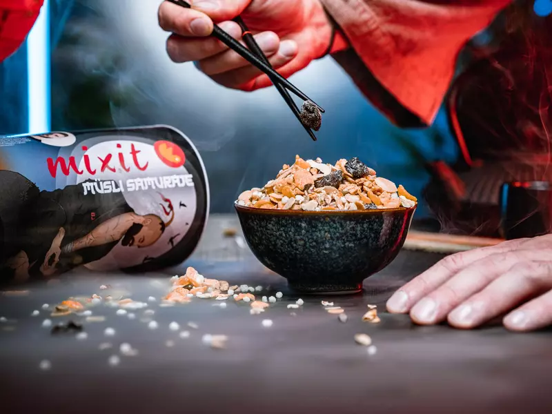 Součástí této sady je také Müsli samuraje, které vzniklo ve spolupráci s dalším sportovcem světového formátu, a sice s Jirkou Procházkou. Vyzkoušejte tuto dobrotu s mandlemi, sušenými višněmi, pekanovými ořechy i čokoládovými peckami.