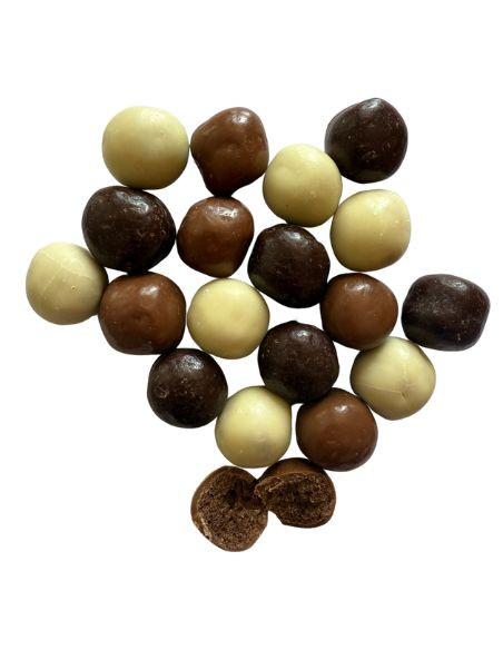 Extrudované kakaové kuličky v bílé, hořké a mléčné čokoládě.