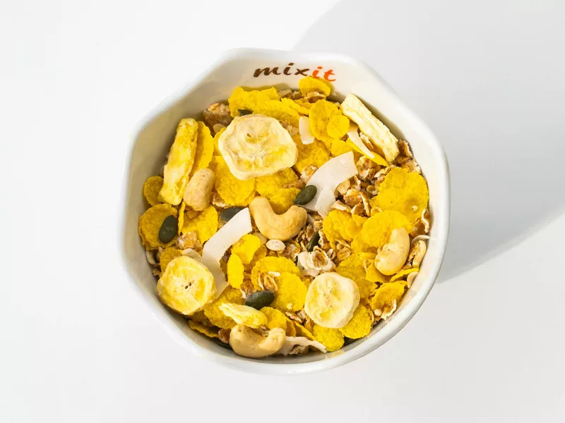 ovesné lupínky 21,7 %, kukuřičné lupínky 21,7 % (kukuřice 94 %, cukr, jedlá sůl), jáhlové lupínky 9,8 %, pšeničné lupínky, rýžové lupínky, jádra kešu ořechů 8,7 %, dýňová semena 5,4 %, semena chia 3,3 % (salvia hispanica), lyofilizovaný banán 2,9 %, kokosové plátky 2,7 %, drcené kakaové boby 2,2 %, lyofilizovaný ananas 2 %