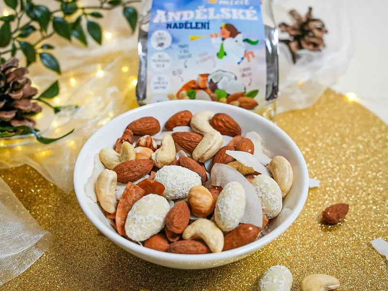Andělské nadělení je naše směs plná neodolatelných dobrot – jako základ jsme použili pražené mandličky v bílé čokoládě posypané strouhaným kokosem. K nim jsme pak přidali ještě přírodní a karamelové kokosové plátky a směs oříšků jako jsou mandle, kešu a lískáče. 🙂