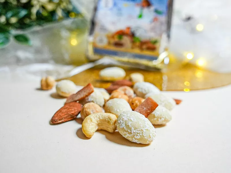 pražené mandle v bílé čokoládě 25 % (bílá čokoláda 69 % (cukr, kakaové máslo, sušené mléko, sušená smetana, emulgátor: lecitiny; přírodní vanilkové aroma), mandle pražené 27 %, kokos strouhaný 3 %, maltodextrin, cukr), mandle 20 %, jádra kešu ořechů 20 %, pražené lískové ořechy 15 %, kokosové plátky 10 %, kokosové plátky s karamelovou příchutí 10 % (dužina kokosového ořechu 68 %, kokosový cukr 31,5 %, mořská sůl 0,5 %)