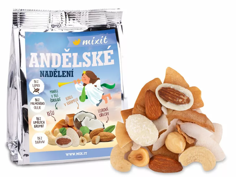 Andělíčku, strážníčku, naplň mi kapsičku. Andělské nadělení do kapsy nepotěší jen hodné děti, ale i relativně hodné dospělé. 🙂 Jako hlavní hvězda této sezónní limitky svítí pražené mandličky v bílé čokoládě posypané strouhaným kokosem. Přihodili jsme k nim kokosové plátky – přírodní i karamelové a směs oříšků. Je to dobrota tak nebeská jako brnkání harfy v obláčcích.