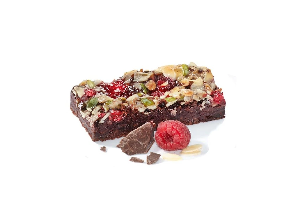 Čokoládový korpus z třené hmoty s červenou řepou, zdobený malinami a směsí ze slunečnicových semen, lískových ořechů, mandlí a dýňových semen, potažený rosolovou polevou, hluboce zmrazený cukrářský výrobek, předkrájený na 12 porcí, bez lepku.