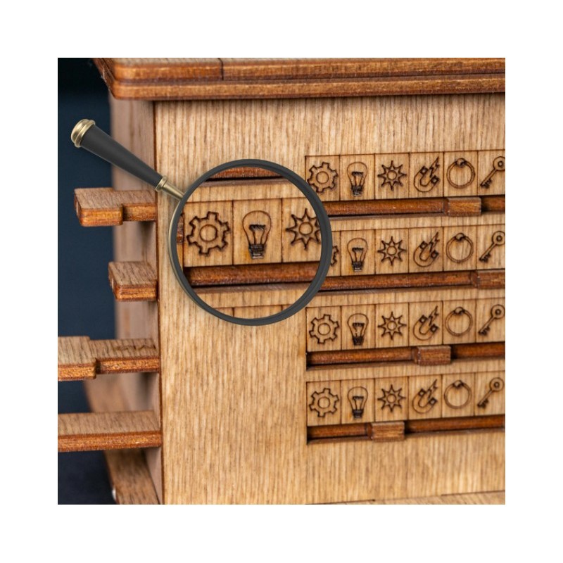 vnitřní rozměr tajného prostoru 1,5×4,5×7,5CM (hlavolam je třeba rozložit a znovu složit dle návodu, zatím pouze v anglickém jazyce)