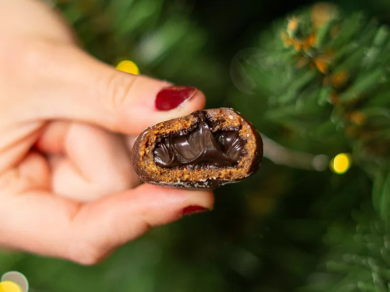Vzali jsme naše oblíbené Crème boule – krémové koule s vrstvou z výběrových datlí a kakaa – a převlékli je do vánočního kabátku. Uvnitř se skrývá sametový krém z piemontských lískových oříšků, který jsme obohatili o kešu a doplnili skořicí, hřebíčkem a badyánem. Výsledek? Malý zázrak, který provoní celý den.