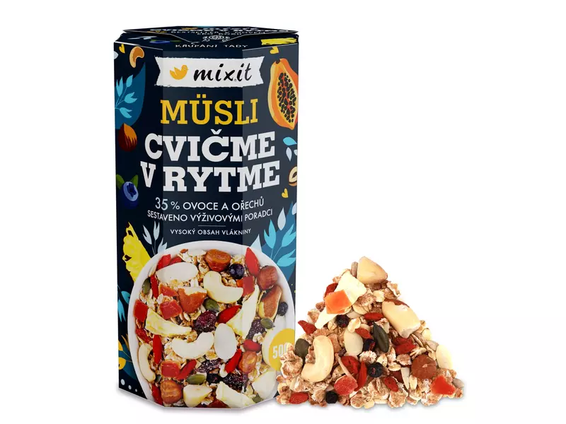 Cvičme v rytme! je chutná a nabitá fitness směs, která vznikla ve spolupráci s profesionálními fitness trenéry. Je sestavená v optimálním poměru živin podle zónové diety aneb bílkoviny:tuky:sacharidy – 20:20:60 (při kombinaci např. 30g müsli a 300ml mléka) a těšit se můžete na vločky, brusinky, lískové oříšky i lněná semínka a spoustu dalších dobrot.