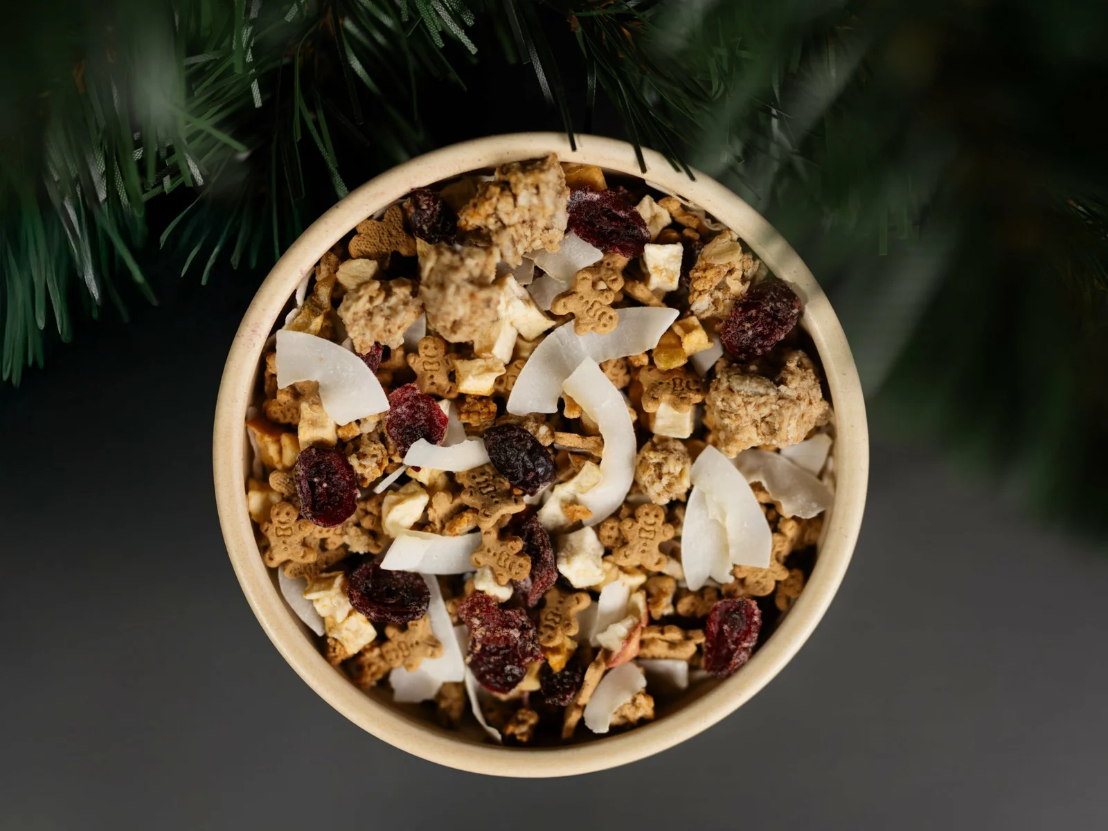 celozrnné ovesné vločky 19 %, klikva 15 % (klikva velkoplodá – „brusinka kanadská“, cukr, slunečnicový olej), mini sušenky s perníkovým kořením 15 % [pšeničná mouka, cukr, kokosový tuk, karamelový sirup, kypřící látka: uhličitany sodné; koření 0,6 % (kardamom, koriandr, hřebíček, nové koření, muškátový oříšek), přírodní perníkové aroma, jedlá sůl, pšeničný škrob, regulátor kyselosti: kyselina citrónová], rýžový sirup, kokosové plátky 10 %, sušená jablka 10 %, arašídový jemný krém (100 % pražené loupané arašídy), mandle plátky 5,7 %, slunečnicová semínka, řepkový olej, směs vánočního koření 0,5 % (cejlonská skořice, hřebíček, badyán)
