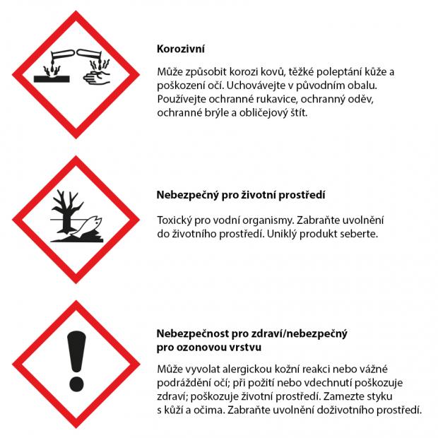 VAROVÁNÍ: Dráždí kůži. Může vyvolat alergickou kožní reakci. Způsobuje vážné podráždění očí. Toxický pro vodní organismy, s dlouhodobými účinky. Uchovávejte mimo dosah dětí. Zabraňte uvolnění do životního prostředí. PŘI STYKU S KŮŽÍ: Omyjte velkým množstvím vody a mýdla. Při podráždění kůže nebo vyrážce: Vyhledejte lékařskou pomoc/ošetření. PŘI ZASAŽENÍ OČÍ: Několik minut opatrně vyplachujte vodou. Vyjměte kontaktní čočky, jsou-li nasazeny a pokud je lze vyjmout snadno. Pokračujte ve vyplachování. Přetrvává-li podráždění očí: Vyhledejte lékařskou pomoc/ošetření. Je-li nutná lékařská pomoc / ošetření, mějte po ruce obal nebo štítek výrobku. Odstraňte obsah/obal podle platných předpisů.