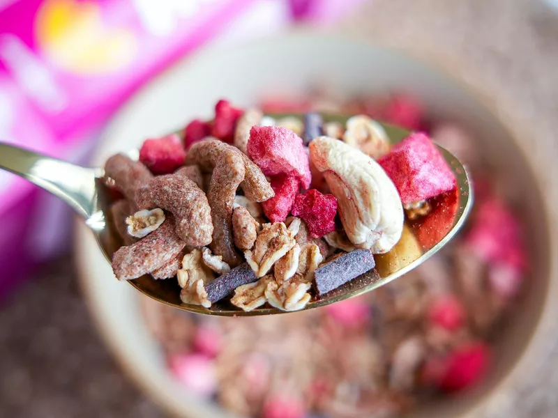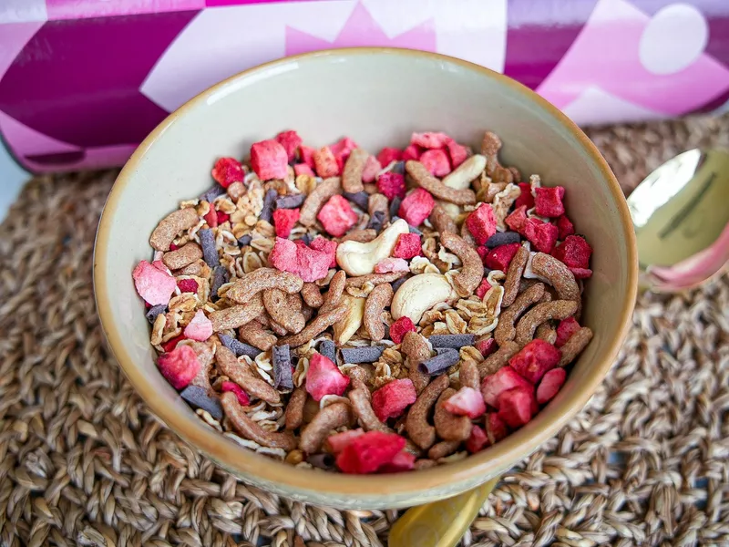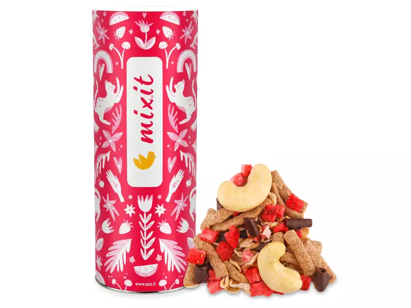 To zní jako Jahodový mix, v němž jsme ke kostičkám mrazem sušených jahod přimixovali kešu oříšky a hoblinky hořké čokolády. V jednoduchosti je krása a také chuť.