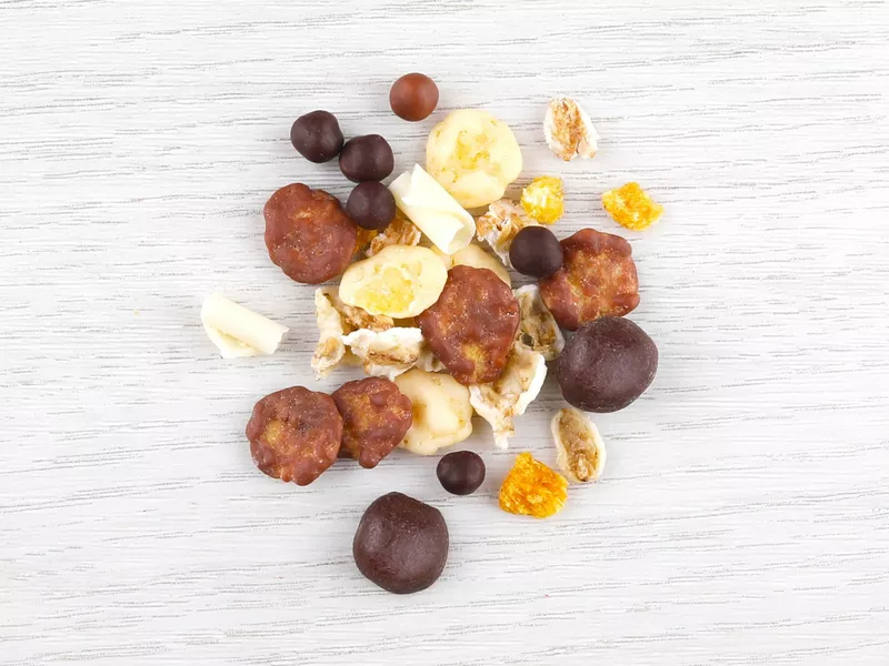 kukuřičné lupínky v mléčné čokoládě (mléčná čokoláda 56 % (cukr, kakaové máslo, sušené plnotučné mléko, kakaová hmota, emulgátor: lecitin; přírodní vanilkové aroma), kukuřičné lupínky 42 % (kukuřičná krupice, cukr, jedlá sůl, ječný sladový výtažek, barvivo: uhličitany vápenaté), lešticí látka: arabská guma; cukr, med), ovesné lupínky, směs čokoládových křupinek (hořká čokoláda 35 % (cukr, kakaová hmota, kakaové máslo, emulgátor: lecitiny; přírodní vanilkové aroma), mléčná čokoláda 35 % (cukr, kakaové máslo, sušené plnotučné mléko, kakaová hmota, emulgátor: lecitiny; přírodní vanilkové aroma), pšeničný extrudát 28 % (pšeničná mouka, pšeničná krupice, cukr, jedlá sůl, kakaový prášek se sníženým obsahem tuku) lešticí látka: arabská guma; cukr, med), pšeničné lupínky, kávová zrna v hořké čokoládě (hořká čokoláda 85 % (cukr, kakaová hmota, kakaové máslo, emulgátor: lecitiny; přírodní vanilkové aroma), pražená kávová zrna 14 %, lešticí látka: arabská guma; cukr, med), kukuřičné lupínky v bílé čokoládě (bílá čokoláda 56 % (cukr, kakaové máslo, sušené plnotučné mléko, sušená smetana, emulgátor: lecitiny; přírodní vanilkové aroma), kukuřičné lupínky 42 % (kukuřičná krupice, cukr, jedlá sůl, ječný sladový výtažek, barvivo: uhličitany vápenaté), lešticí látka: arabská guma; cukr, med), čokoládové hobliny bílé (cukr, sušené plnotučné mléko, kakaové máslo 23,5 %, emulgátor: sójový lecitin; přírodní vanilkové aroma), lyofilizovaný pomeranč