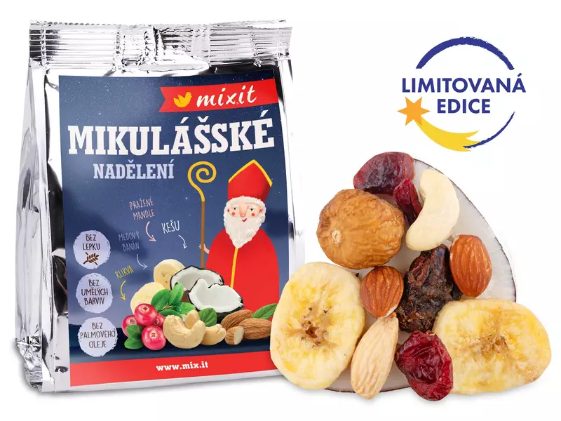 Stále ještě přemýšlíte nad ideální dobrotou pro vaše malé zlobivce? Vsaďte na Mikulášské nadělení – zobání plné oříšků a ovoce jako jsou mini fíky, medový banán nebo brusinky. Bez lepku, umělých barviv i palmového oleje. 🙂