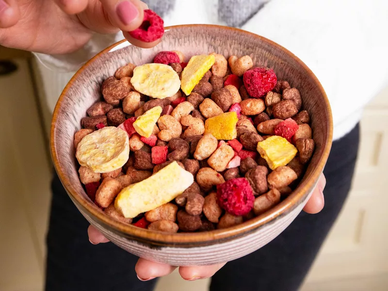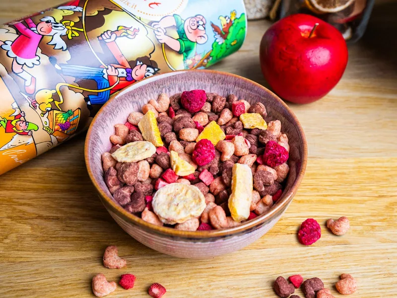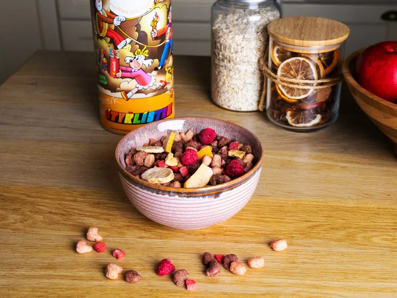 Kromě Peep Peep jsme do mixu přidali ještě pořádnou porci ovoce. Můžete se tak těšit na mango, banán, jahody i maliny. Ovoce je samozřejmě bez přidaného cukru a díky lyofilizaci je krásně křupavé, což děti opravdu milují.