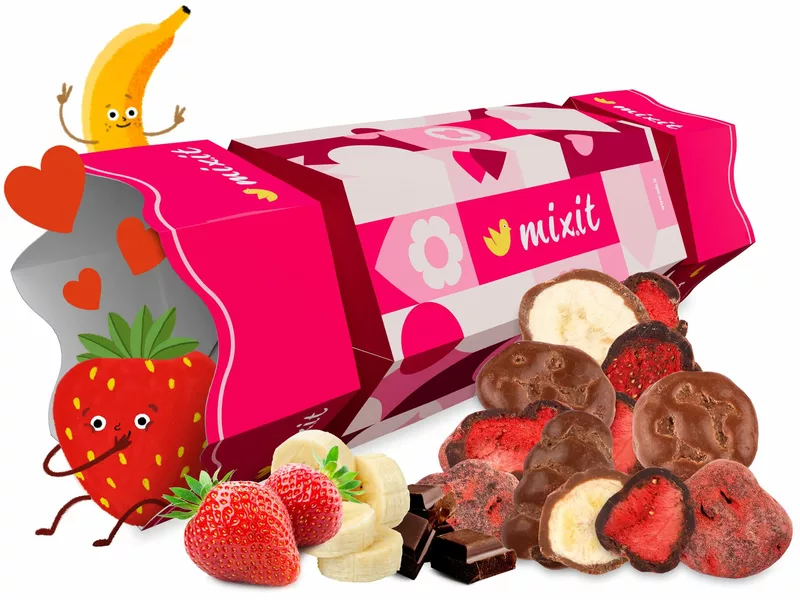 Darujte originální bonbón plný křupavých banánků a jahod v čokoládě. Zralé a slaďounké banány s jahodami jsme nejdříve proměnili v křupavou dobrotu procesem lyofilizace, tedy sušením mrazem, a pak jsme banánky obalili v pořádné vrstvě mléčné čokolády. A jahodám dopřáli koupel zas v hořké čokoládě. A pak to vše zabalili do krásného dárkového balení. Darujte dokonalé spojení tradičních chutí bez zbytečných umělých přísad a bez palmového oleje.
