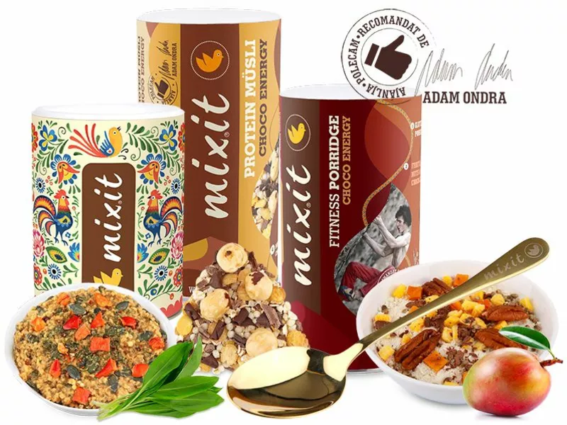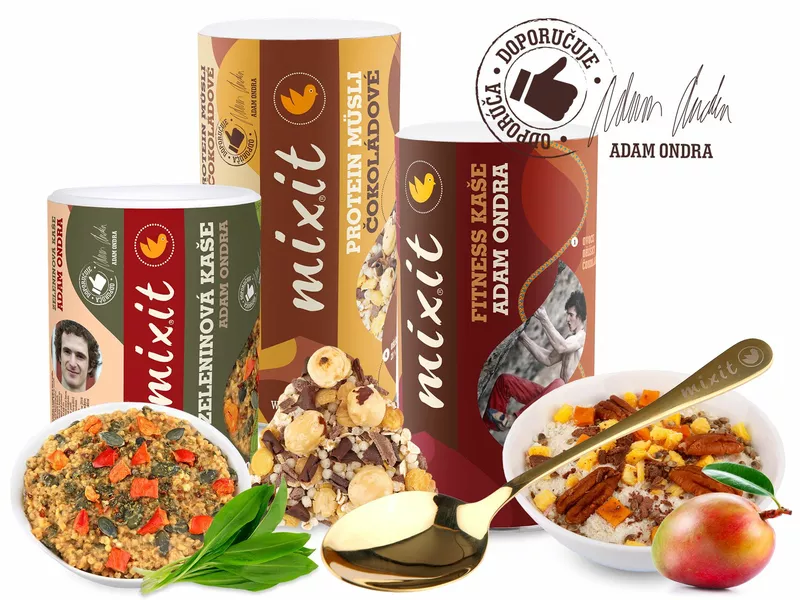 Jsme hrdí, že nejlepší lezec na světě, Adam Ondra, s Mixit již od roku 2018 vyvíjí autorskou řadu dobrot! Kterou z nich si šplhne u vás? Vyzkoušejte 3 Adamovy produkty ve výhodné sadě – zeleninovou delikatesu bez přidaného cukru, bez lepku a s vydatnou porcí bílkovin. To vše navíc bez použití mléčné bílkoviny a laktózy. Mixovali jsme doslova se super ingrediencemi. Dále ochutnáte bestseller v podobě čokoládové kaše s pekany a nabušené proteinové müsli s čokoládou. Na Adamovo přání jsou všechny produkty bez lepku. 🙂