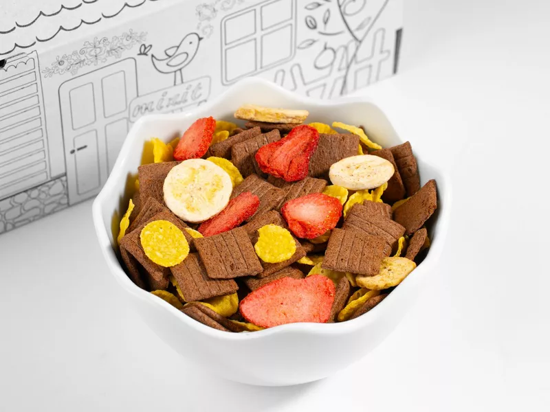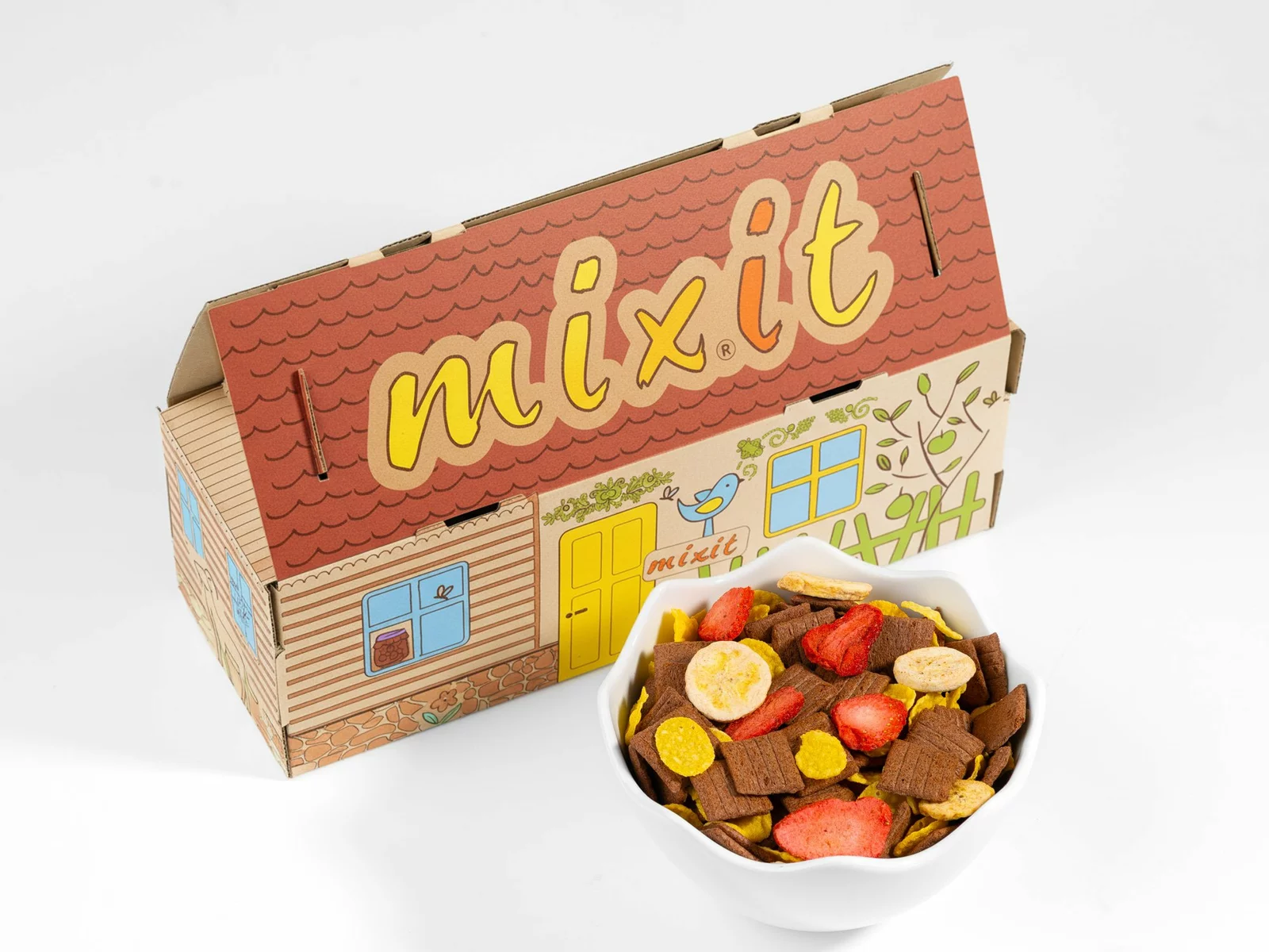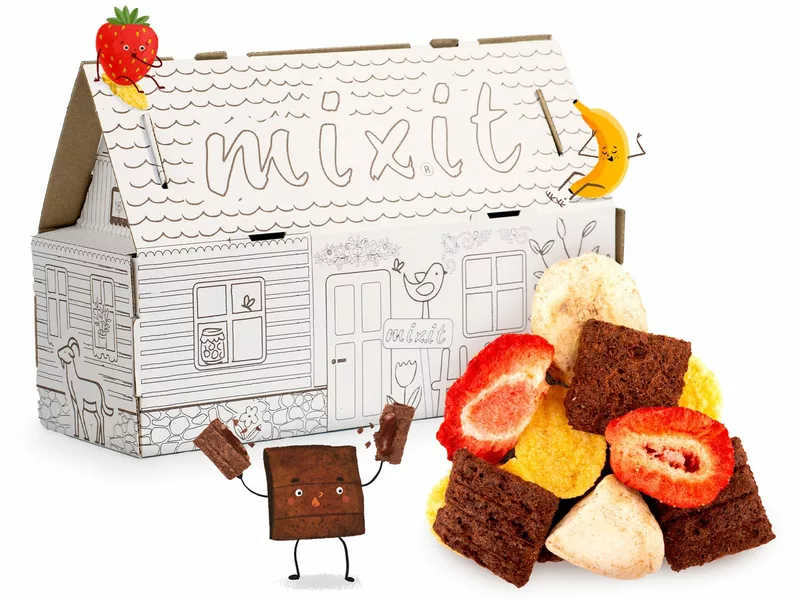 Oblíbený Hravý mix s lyofilizovanými jahodami, banány a kakaovými polštářky. Tentokrát v novém balení, ze kterého si děti mohou složit vlastní domeček a vybarvit ho podle vlastní fantazie.