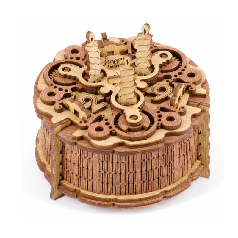 Narozeninový dort iDventure je mechanická dřevěná krabička s tajným sejfem uvnitř, která slouží jako jedinečná dárková krabička.