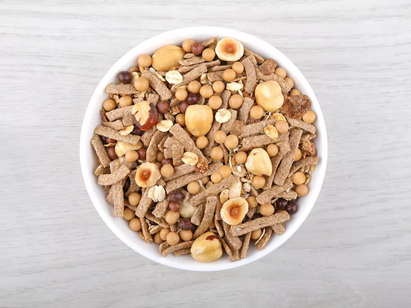 zrní z pece 32 % (ovesné vločky 72 %, rýžové lupínky 19 %, med 4,5 %, kokosový cukr 4,5 %), křupinky se slaným karamelem 23 % (bílá čokoláda s karamelem 70 % (cukr, kakaové máslo, sušené mléko, karamelový prášek s mléčným tukem (sušené mléko, sušená syrovátka, cukr, mléčný tuk, přírodní vanilkové aroma),karamelizovaný cukr, kakaová hmota, emulgátor: lecitiny; sůl), pšeničné kuličky 28 % (pšeničná mouka 79,4 %, cukr 19,9 %, kakao se sníženým obsahem tuku 0,2 %, sůl 0,5 %), sůl 1 %, lešticí látka: arabská guma; cukr, med), vláknina 20 % (pšeničné otruby 41,5 %, pšeničná mouka celozrnná 17,6 %, kukuřičná vláknina 15,5 %, cukr, glukóza, kukuřičný škrob, emulgátor: slunečnicový lecitin; ječný sladový výtažek, slunečnicový olej s rozmarýnem (slunečnicový olej, antioxidant: extrakt z rozmarýnu), skořice 0,3 %, přírodní medové aroma, minerální látka: uhličitan vápenatý), směs čokoládových křupinek 15 % (hořká čokoláda 35 % (cukr, kakaová hmota, kakaové máslo, emulgátor: lecitiny; přírodní vanilkové aroma), mléčná čokoláda 35 % (cukr, kakaové máslo, sušené plnotučné mléko, kakaová hmota, emulgátor: lecitiny; přírodní vanilkové aroma), pšeničný extrudát 28 % (pšeničná mouka, pšeničná krupice, cukr, jedlá sůl, kakaový prášek se sníženým obsahem tuku), lešticí látka: arabská guma; cukr, med), jádra pražených lískových ořechů 10 %