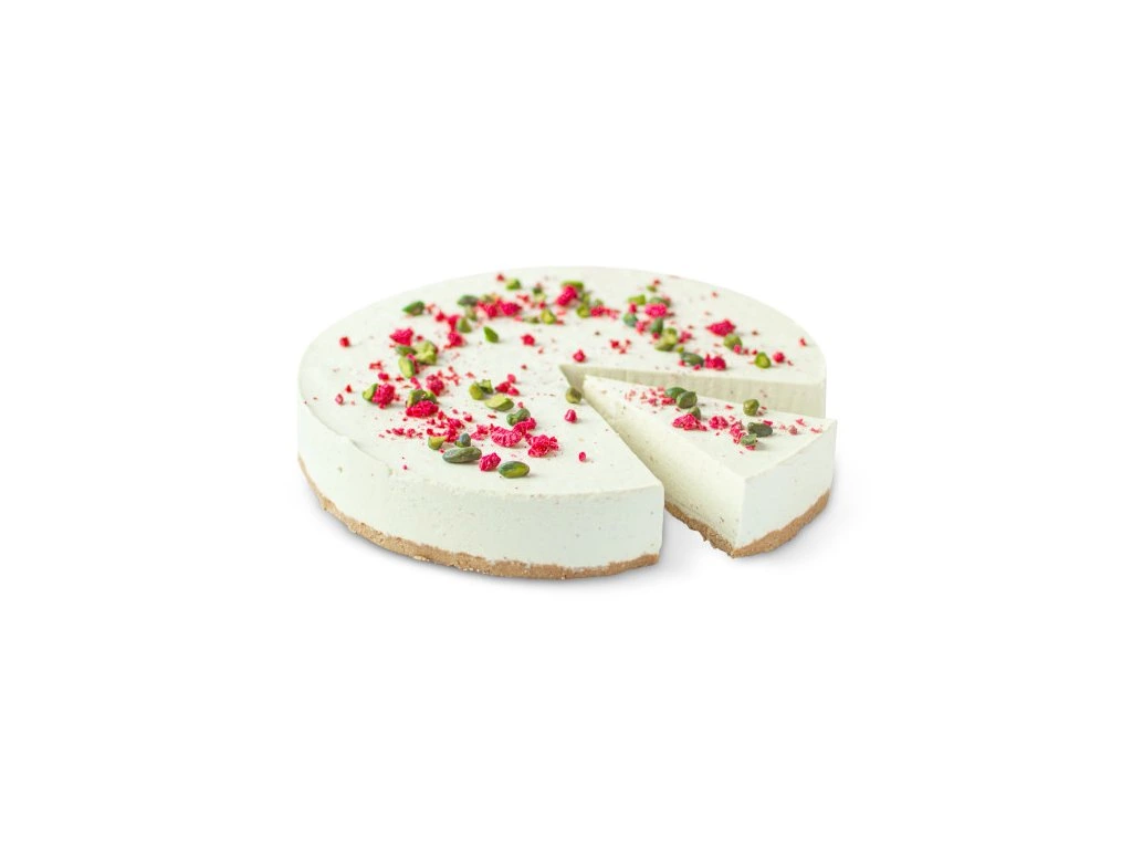 Sušenkový korpus a vysoká vrstva lahodného tvarohového krému s pistáciovou příchutí. Na svém povrchu je dort ozdoben lyofilizovanými malinami a pistáciemi.