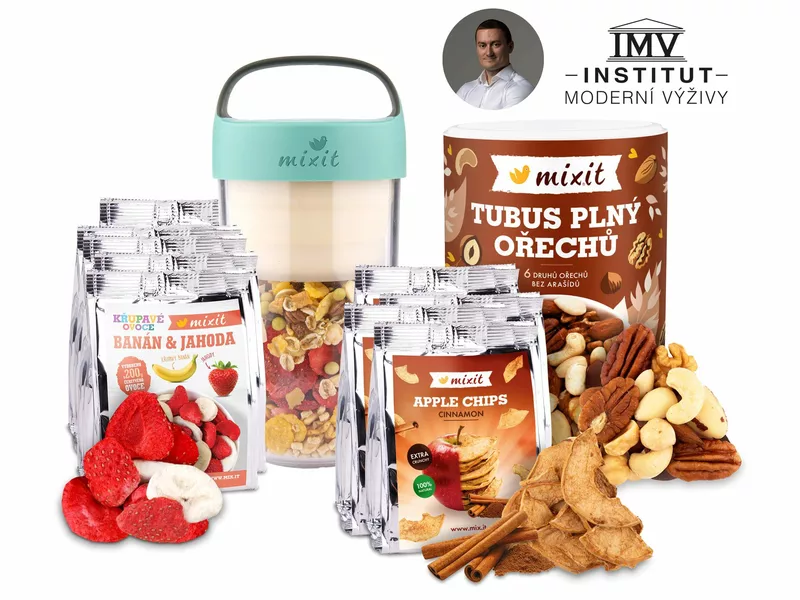 1x Tubus plný ořechů (350 g), 5x Křupavý Banán + Jahoda do kapsy (23 g), 5x Jablečné chipsy – Skořice do kapsy (25 g), 1x Mixit 2go – svačinový box 600 ml (mintový)