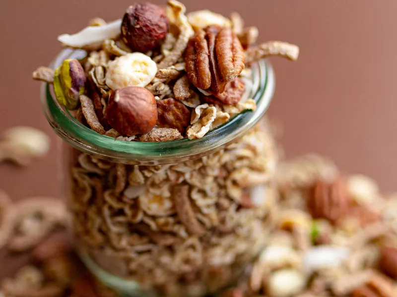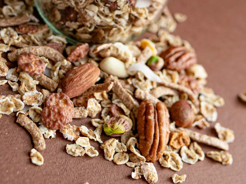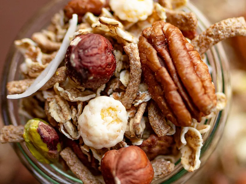 ovesné lupínky, vláknina (pšeničné otruby 41,5 %, pšeničná mouka celozrnná 17,6 %, kukuřičná vláknina 15,5 %, cukr, glukóza, kukuřičný škrob, emulgátor: slunečnicový lecitin; ječný sladový výtažek, slunečnicový olej s rozmarýnem (slunečnicový olej, antioxidant: extrakt z rozmarýnu), skořice 0,3 %, přírodní medové aroma, minerální látka: uhličitan vápenatý), pšeničné lupínky, kukuřičné lupínky v mléčné čokoládě (mléčná čokoláda 56 % (cukr, kakaové máslo, sušené plnotučné mléko, kakaová hmota, emulgátor: lecitin; přírodní vanilkové aroma), kukuřičné lupínky 42 % (kukuřičná krupice, cukr, jedlá sůl, ječný sladový výtažek, barvivo: uhličitany vápenaté), lešticí látka: arabská guma; cukr, med), arašídy, kukuřičné lupínky v bílé čokoládě (bílá čokoláda 56 % (cukr, kakaové máslo, sušené plnotučné mléko, sušená smetana, emulgátor: lecitiny; přírodní vanilkové aroma), kukuřičné lupínky 42 % (kukuřičná krupice, cukr, jedlá sůl, ječný sladový výtažek, uhličitan vápenatý), lešticí látka: arabská guma; cukr, med), kokosové plátky 6 %, jádra mandlí 5 %, jádra lískových ořechů 4 %, jádra pekanových ořechů 3 %, loupaná jádra pistácií 2 %