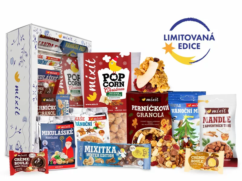 Najdete v ní všechno, co dělá svátky tak kouzelné: voňavou Perníčkovou granolu, limitovaný Vánoční popcorn, dvě Crème boule v oblíbené variantě Cinnamon Chocolate i speciální vánoční edici à la vaječný likér. K tomu jsme přidali ještě poctivé Mandle z adventních trhů a nechybí ani oblíbený Vánoční mix, Vánoční kaše, Vánoční Mixitka a Mikulášské nadělení. Víc dobrot už si pod stromečkem snad ani přát nejde, že? 🙂