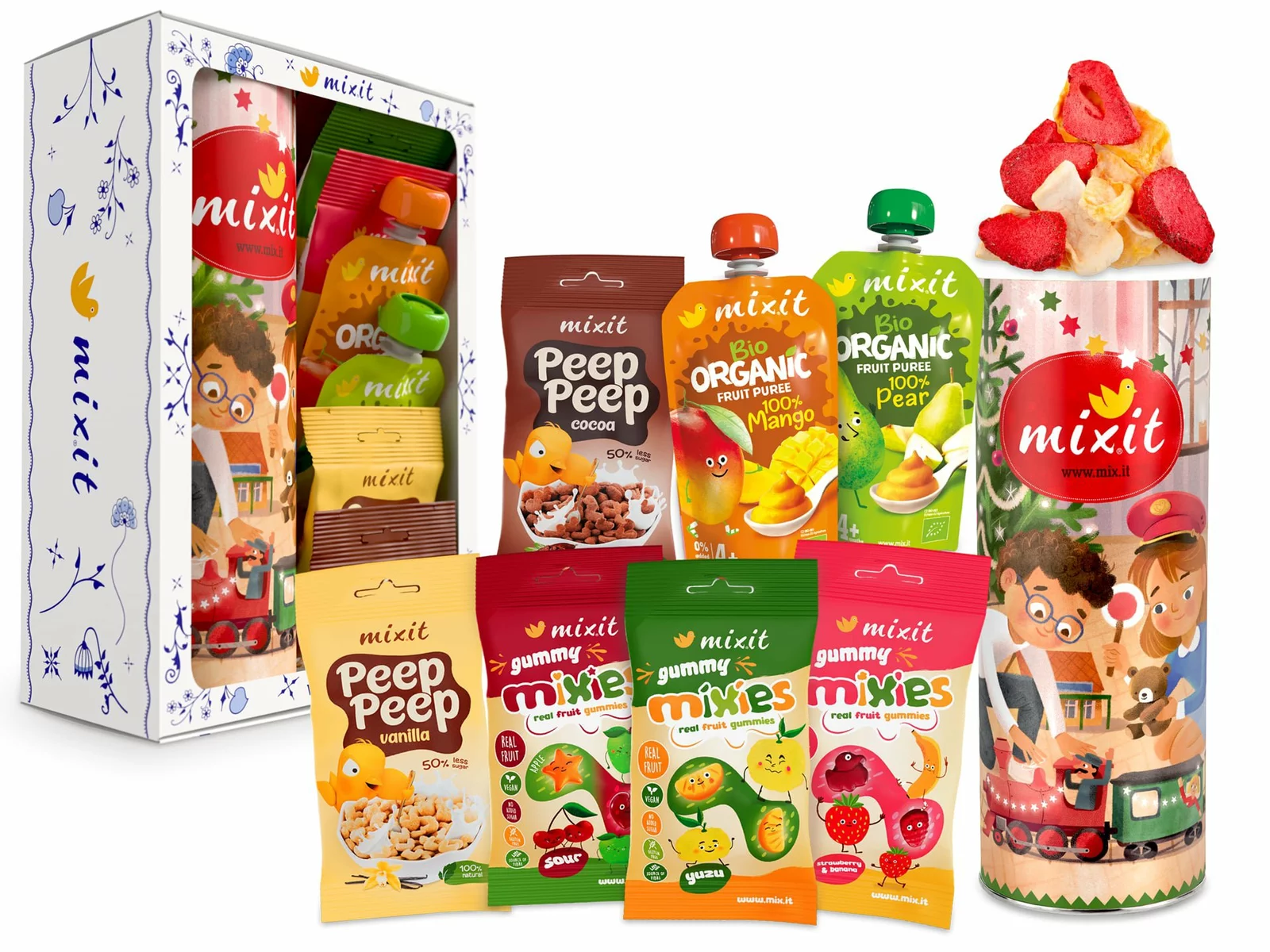 1x Velké křupavé ovoce – Mango a jahoda (140 g), 1x Mixit BIO ovocná kapsička – 100% Mango (100 g), 1x Mixit BIO ovocná kapsička – 100% Hruška (100 g), 1x Ovocné Mixies – Jablko & třešeň – přírodní želé bonbóny (35 g), 1x Ovocné Mixies – Yuzu – přírodní želé bonbóny (35 g), 1x Ovocné Mixies – Jahoda & banán – přírodní želé bonbóny (35 g), 1x Cereálie Peep Peep – Kakao do kapsy (25 g), 1x Cereálie Peep Peep – Vanilka do kapsy (25 g), 1x Vánoční dárková sada na míru (Pro 2 tubusy)