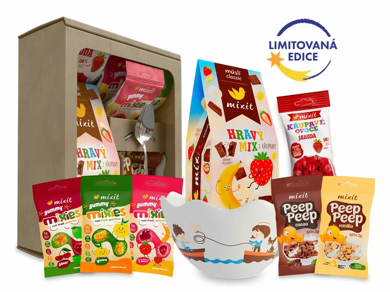 Dárek, který potěší nejen všechny malé Mixiťáky, ale i jejich rodiče? Přece Vánoční dárková sada pro děti, do které jsme namixovali dětmi oblíbené křupavé ovoce v podobě Jahůdky Pohůdky a cereálie Peep Peep s vanilkou i kakaem, které obsahují díky datlovému sirupu až o 50 % méně cukru. Snídani zpestří také Hravý mix a do kapsy nebo batůžku skočí trojice pytlíků 100% přírodních želé bonbónků Mixies.
