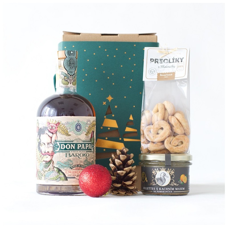 Vánoční krabice s rumem Don Papa ve speciální edici Baroko. K lahodnému moku si dopřejete také škvarkové preclíky z chráněné dílny Blatnička a nebo skvělý kachní rillettes.