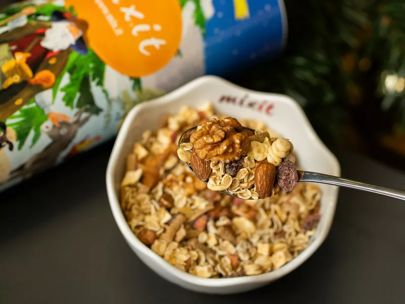 Dopřejte si v předpremiéře k snídani voňavou müsli směs sušeného ovoce, čokolády a oříšků doladěnou skořicí, hřebíčkem a badyánem.