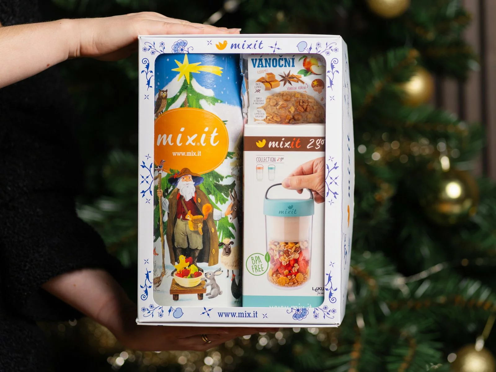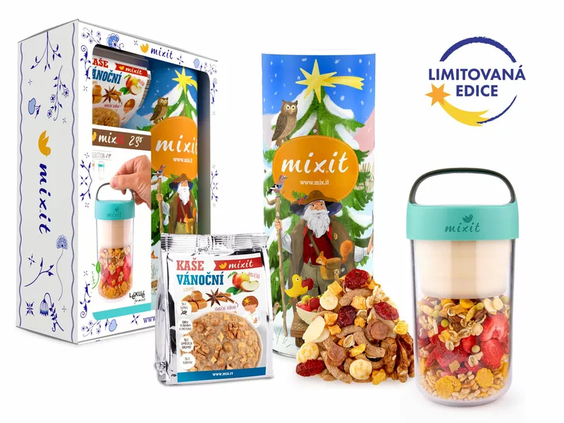 1x Vánoční MIX (625 g), 1x Mixit 2go – svačinový box 600 ml (mintový), 1x Vánoční kaše do kapsy (60 g), 1x Vánoční dárková sada na míru (Pro 2 tubusy)