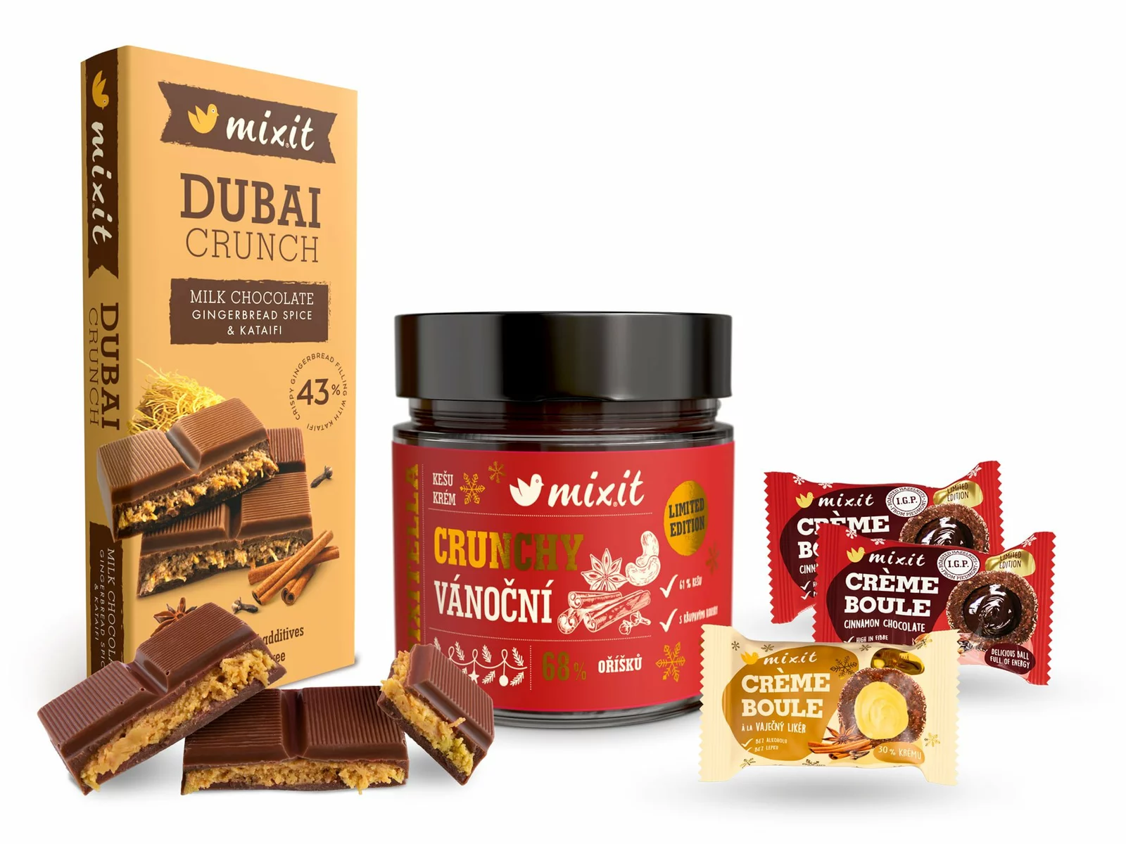 Jak moc máte rádi Vánoce? Pro všechny, kdo milují vůni skořice, praskání svíček a tu nezaměnitelnou zimní pohodu, jsme připravili sadu, která ve vás probudí tu nejkrásnější vánoční atmosféru. Čeká na vás Vánoční Crunchy Mixitella s kešu, lískovými oříšky, kataifi, skořicí, hřebíčkem a badyánem. Nechybí Vánoční dubajská čokoláda s perníkovým koření & kataifi, Crème boule – à la Vaječný likér a dvě Crème boule Cinnamon Chocolate.